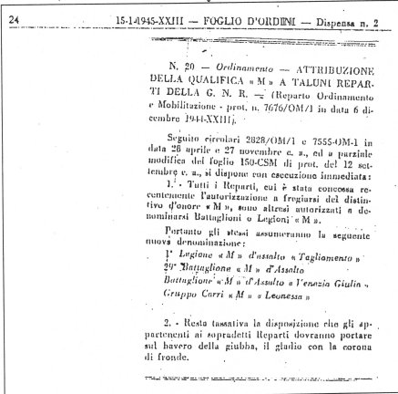 2-Resta tassativa la disposizione che gli appartenenti ai sopradetti Reparti dovranno portare sul bavero della giubba, il gladio con la corona di fronde.